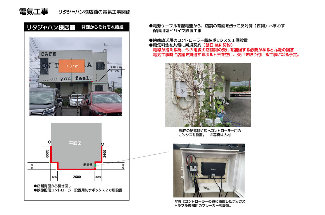 単独で電気を通す場合や、子メーターでの対応など、状況に合わせて電気工事を行います。その際にコントローラーやWiFi、4G回線での接続を考慮し防水ボックスの設置位置やブレーカーの配置など、のちのちの起こりえるトラブルを考慮した電気工事、配置を行います。