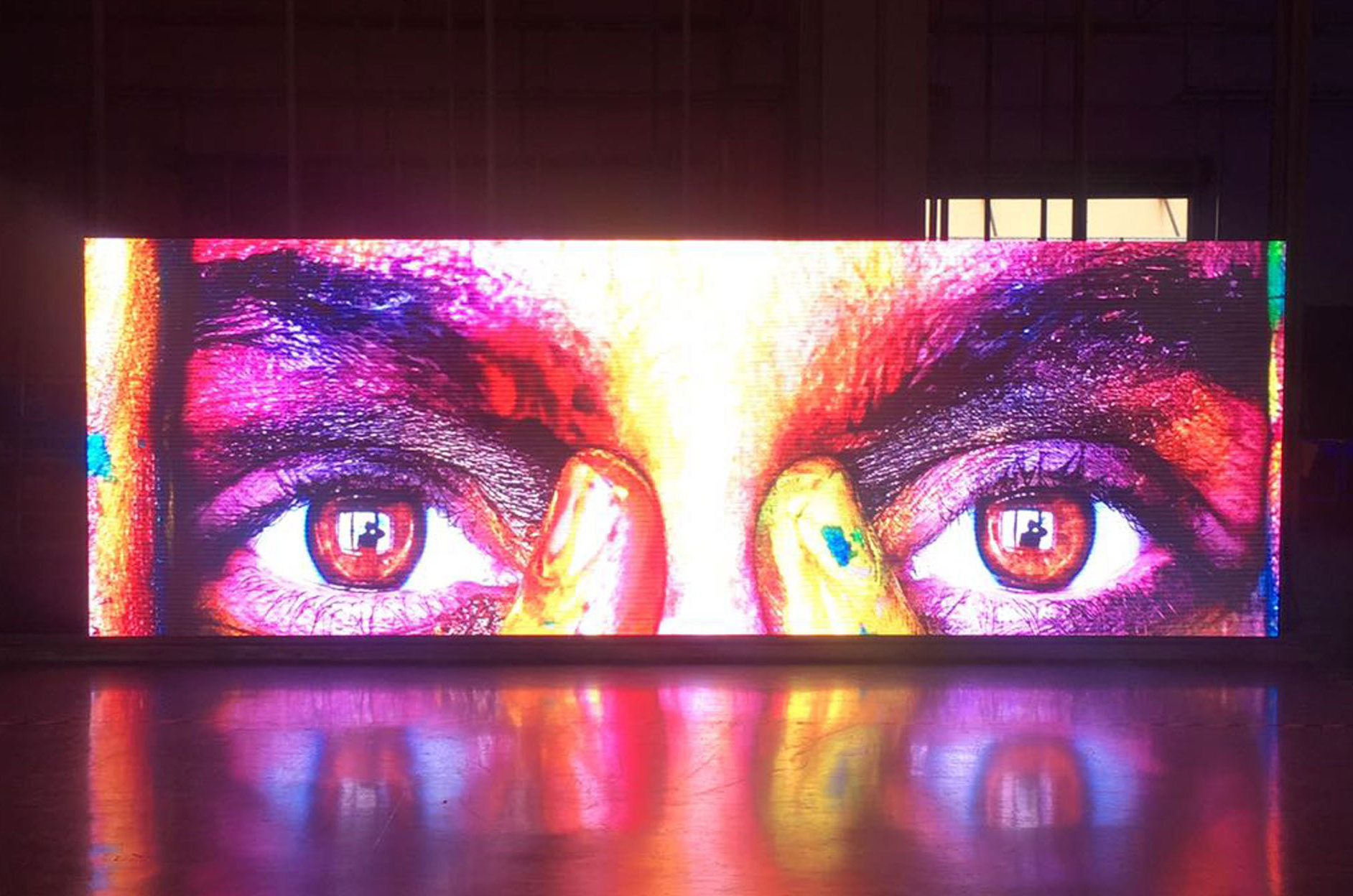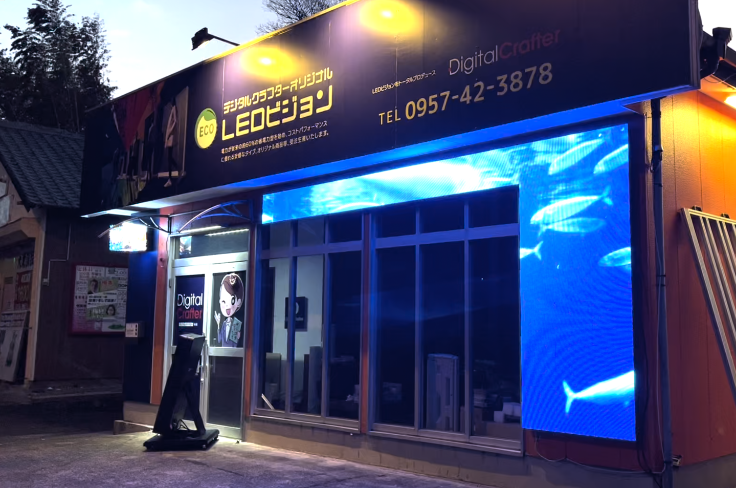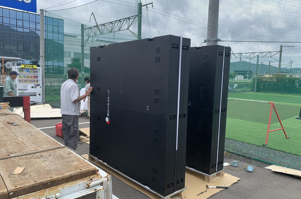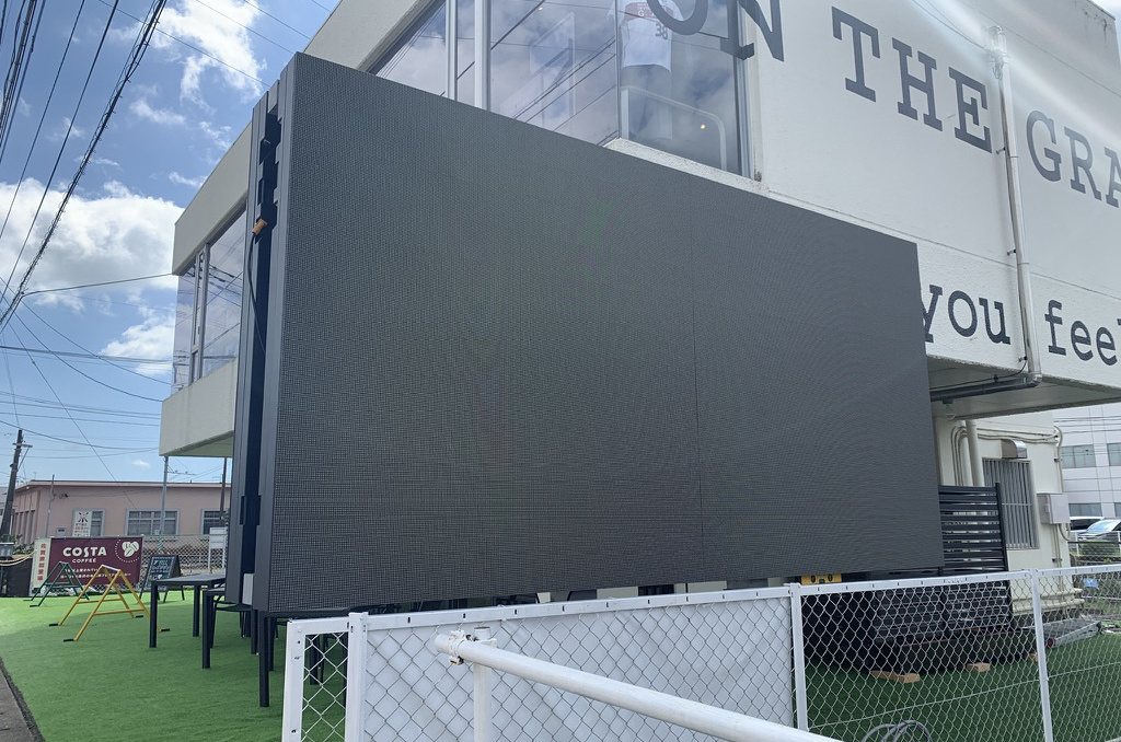 写真は製造中のテスト段階のものです。W7040mm×1920mm大画面になるほど電力を要します。写真の大きさで電気代は約3万円/月ほどです。標準型のパネルの場合、5万円/月ほどかかりますので、ランニングコストは年間24万円も違ってきます。