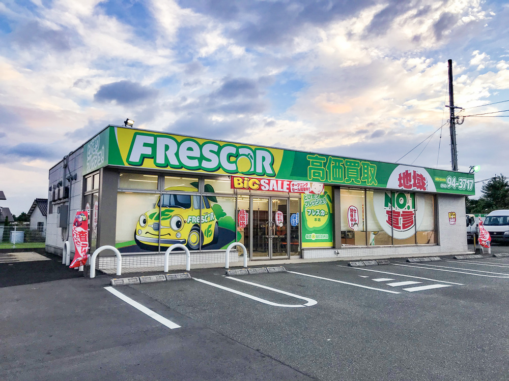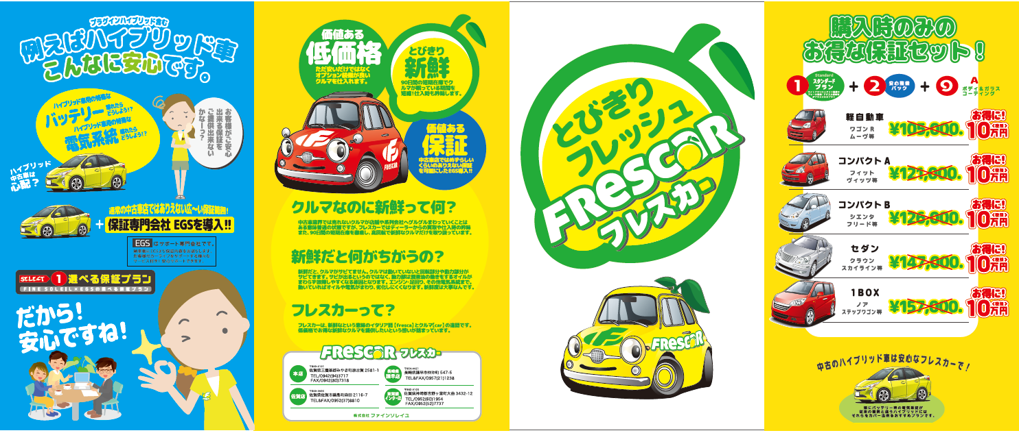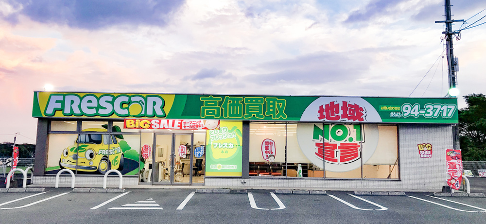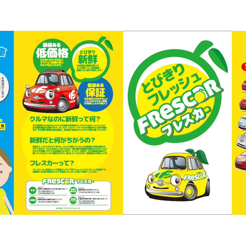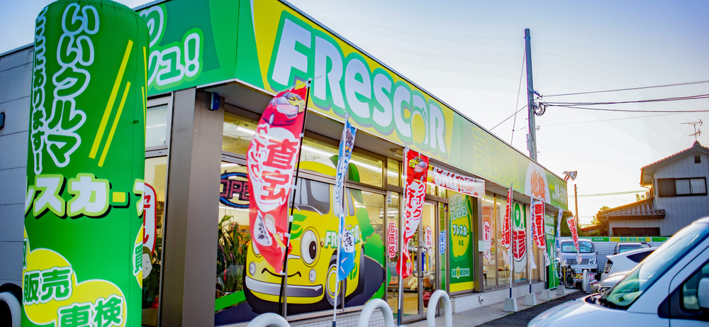 在庫期間90日という、一般的な中古車とは違う方針を打ち出しました。名前のフレスカーはイタリア語の【新鮮な FRESCA】と【車 CAR】をかけた名前です。とびきりフレッシュな在庫を柑橘系の黄色と緑色で表現しています。大人気の中古車店です。