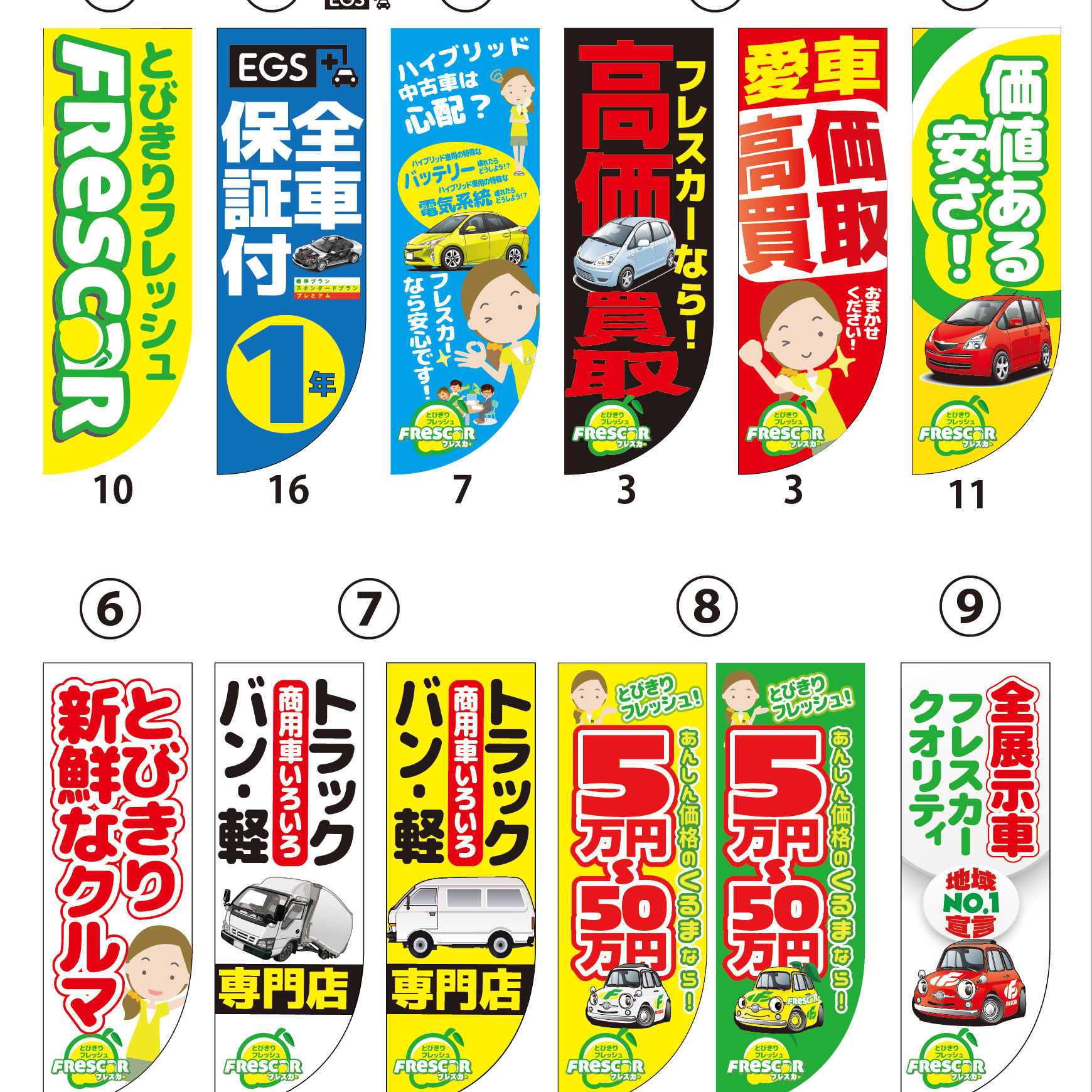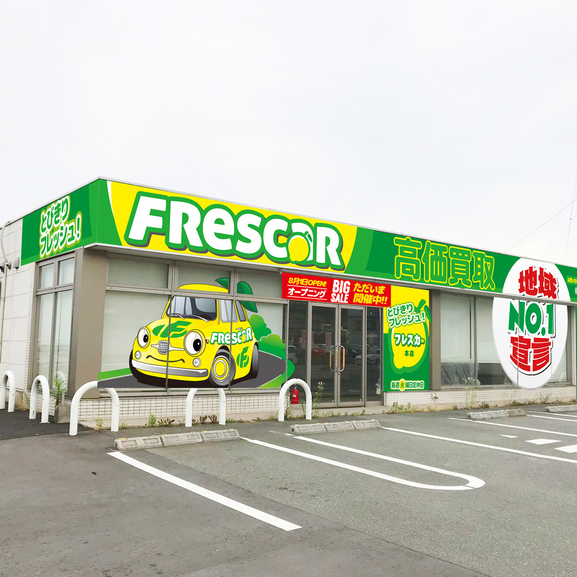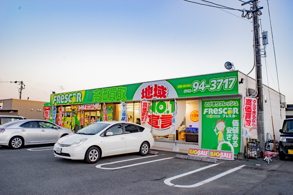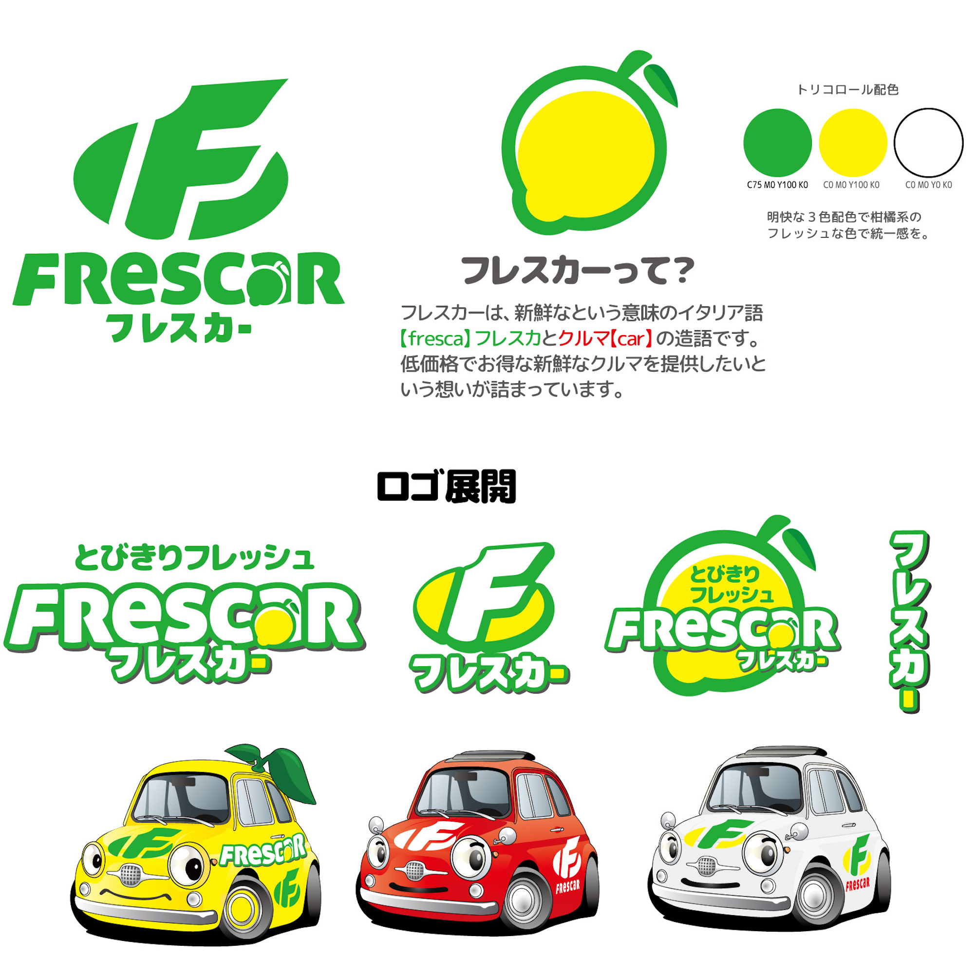 在庫期間90日という、一般的な中古車とは違う方針を打ち出しました。名前のフレスカーはイタリア語の【新鮮な FRESCA】と【車 CAR】をかけた名前です。とびきりフレッシュな在庫を柑橘系の黄色と緑色で表現しています。大人気の中古車店です。