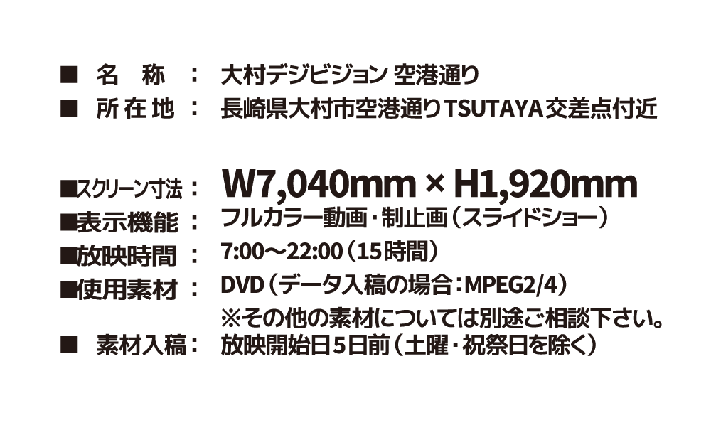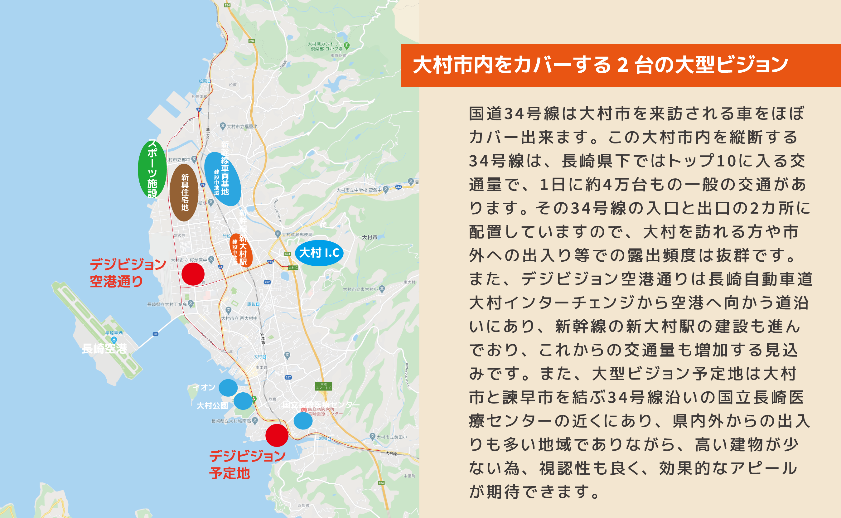 この大型のLEDビジョンは大村インターチェンジから、新幹線「新大村駅」(建設中)を通り、長崎空港へと続いている空港通りに向かって設置されています。また、大型スーパーのマックスバリューさんやメガネの三城さん、ツタヤさん、インターネットカフェの快活クラブさんが集まる交差点付近のファミリーマートさんの大型駐車場側に向けた視界が開けた場所にあり、大きな広告効果が期待できる立地です。大村の西側の中心地において大村市で最大のLEDビジョンになります。
