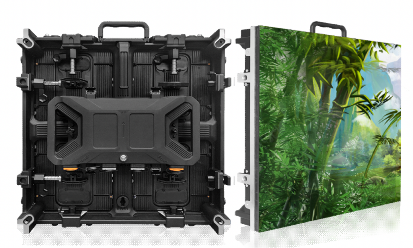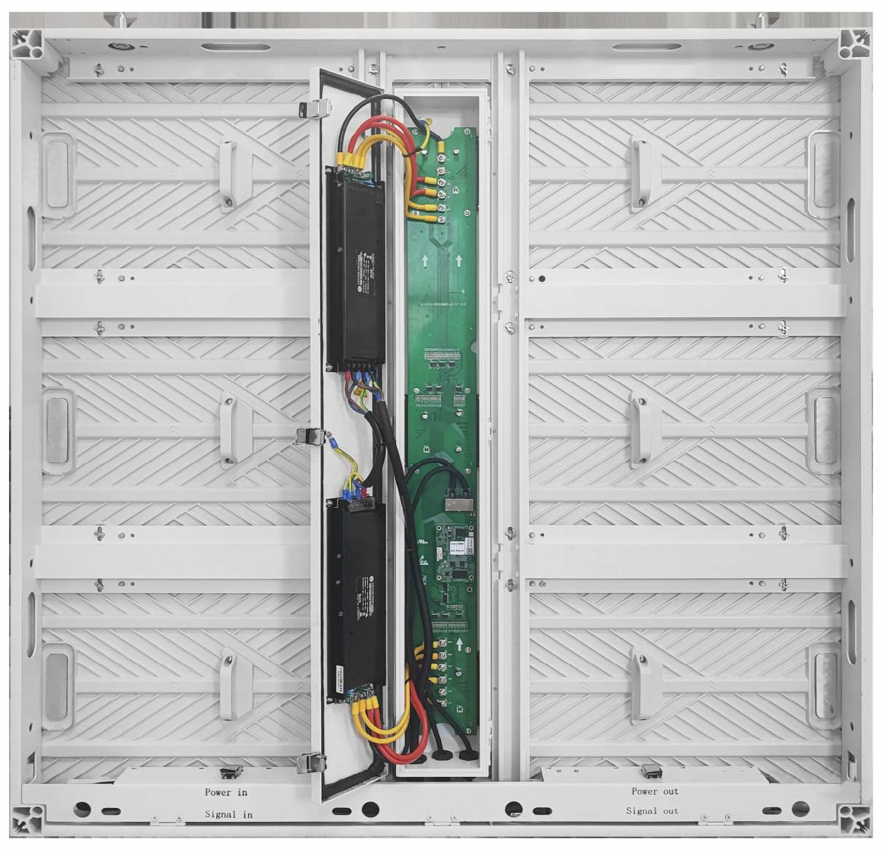 本体キャビネットサイズ W500mm×H500mmで、一般的なサイズです。省電力ではありませんが、このキャビネットの最大の特徴は、様々なモジュール(画面パネル)を選択可能という優位性にあります。選択できる解像度が1.56からと非常に高く、また、Black LED P2.6へも換装できます。また、COBに対応しており、耐衝撃、高コントラスト、高耐久性、高精細という、いいとこ取りの製品になります。唯一の欠点は、リアメンテナンスしかできないことで、そのため、壁面への設置には、裏側にウォークスルーを設ける必要があり、どちらかというと自立型のLED看板におすすめです。アドトラックやステージトラックへの設置であれば裏側からのメンテナンスが可能ですのでおすすめです。最新のキャビネットで、部品交換が誰でも可能な様につくられており、もし基盤や電源や送信カードが故障したとしても、裏面のBOXをネジでまるまる交換することですぐにアクシデントから復旧することができます。COBであれば、プラスチックハンマーで叩いても壊れない耐久性があるため、子供や通りすがりの人が触れる様なエリアへの設置がおすすめです。