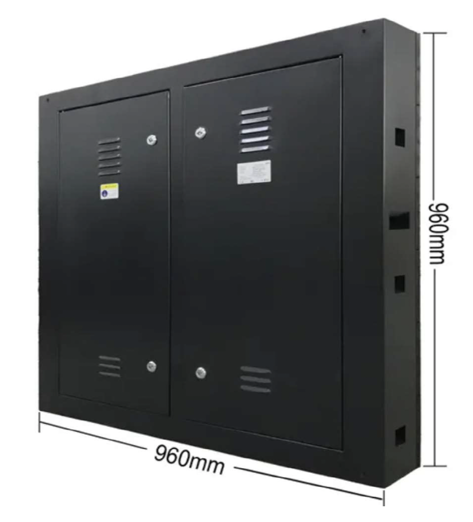 本体キャビネットサイズ W500mm×H500mmで、一般的なサイズです。省電力ではありませんが、このキャビネットの最大の特徴は、COBモジュール(配線なし基盤直結LED&ハードコーティング)でありながらフロントメンテナンス製品であるという事です。その為、壁などへの設置に向いており、P1.96の解像度とも相まって、屋外用としてこの先数年先のスタンダード製品となりえます。COBに対応しており、耐衝撃、高コントラスト、高耐久性、高精細という、いいとこ取りの製品になります。最新のキャビネットで、COBであれば、プラスチックハンマーで叩いても壊れない耐久性があるため、子供や通りすがりの人が触れる様なエリアへの設置がおすすめです。