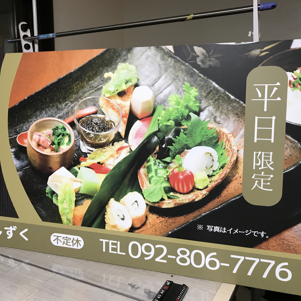 季節メニュー等の懸垂幕です。ラテックスインクで擦過性に強いです。