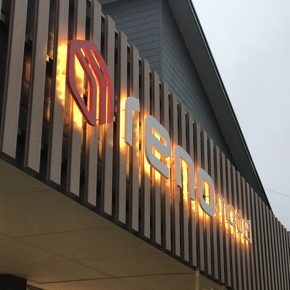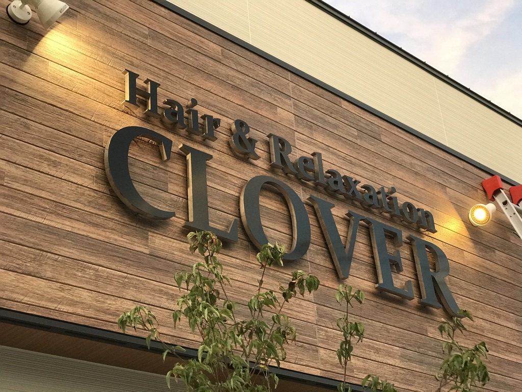 立体文字と袖看板。既製の袖看板に電照用のフィルムを貼りました。