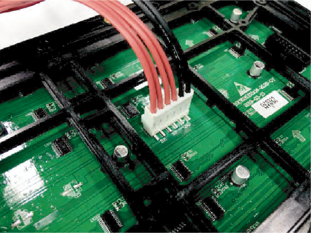 省電力型の基盤の配線写真です。従来型は配線が4本ですが、省電力型は6本になります。RGBランプはそれぞれの色が駆動する電圧には違いがあります。従来型の場合、LEDビジョンはこのレッド、グリーン、ブルーの各LEDを5Vの同じ電圧をかけて発光させています。省電力型は、それぞれのランプへ適正な電圧を個別にかけることで、従来型の余分な電力を省く事が出来るというシステムです。