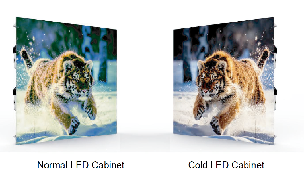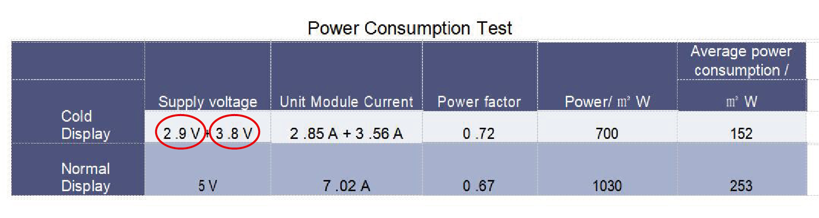 発色させる電圧はレッド・グリーン&ブルーで異なり、(Rは2.5V、GBは3.8V)そのため従来は3.8Vを超える5Vを3つのLEDに一率的に流していました。この為、赤の映像でも5V流す事になり。電力ロスや発熱、カラー発色にも影響していました。コールドディスプレイは、RとGBへの供給をそれぞれ分ける事で、電力の損失と発熱を減らす事が可能となった、業界のこれからのスタンダードになる技術です。