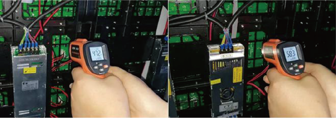 写真は従来型と省電力型の基板温度の違いです。省電力が従来型と比べ、16〜25度ほど低い温度になります。これはパネルの耐久性や発色に良い影響を及ぼします。