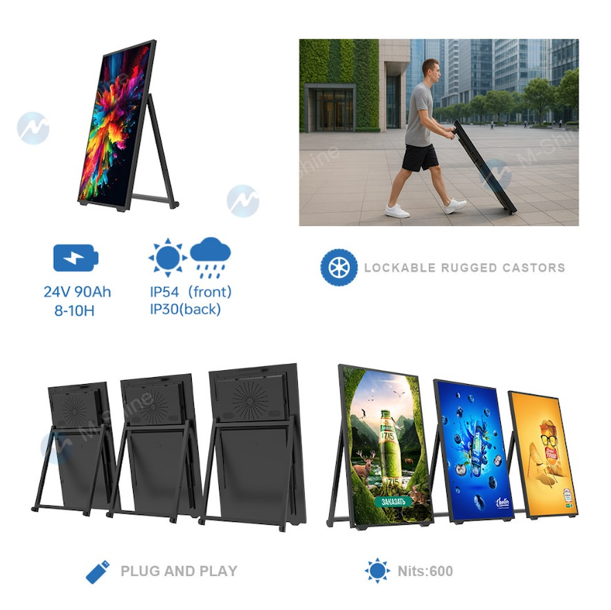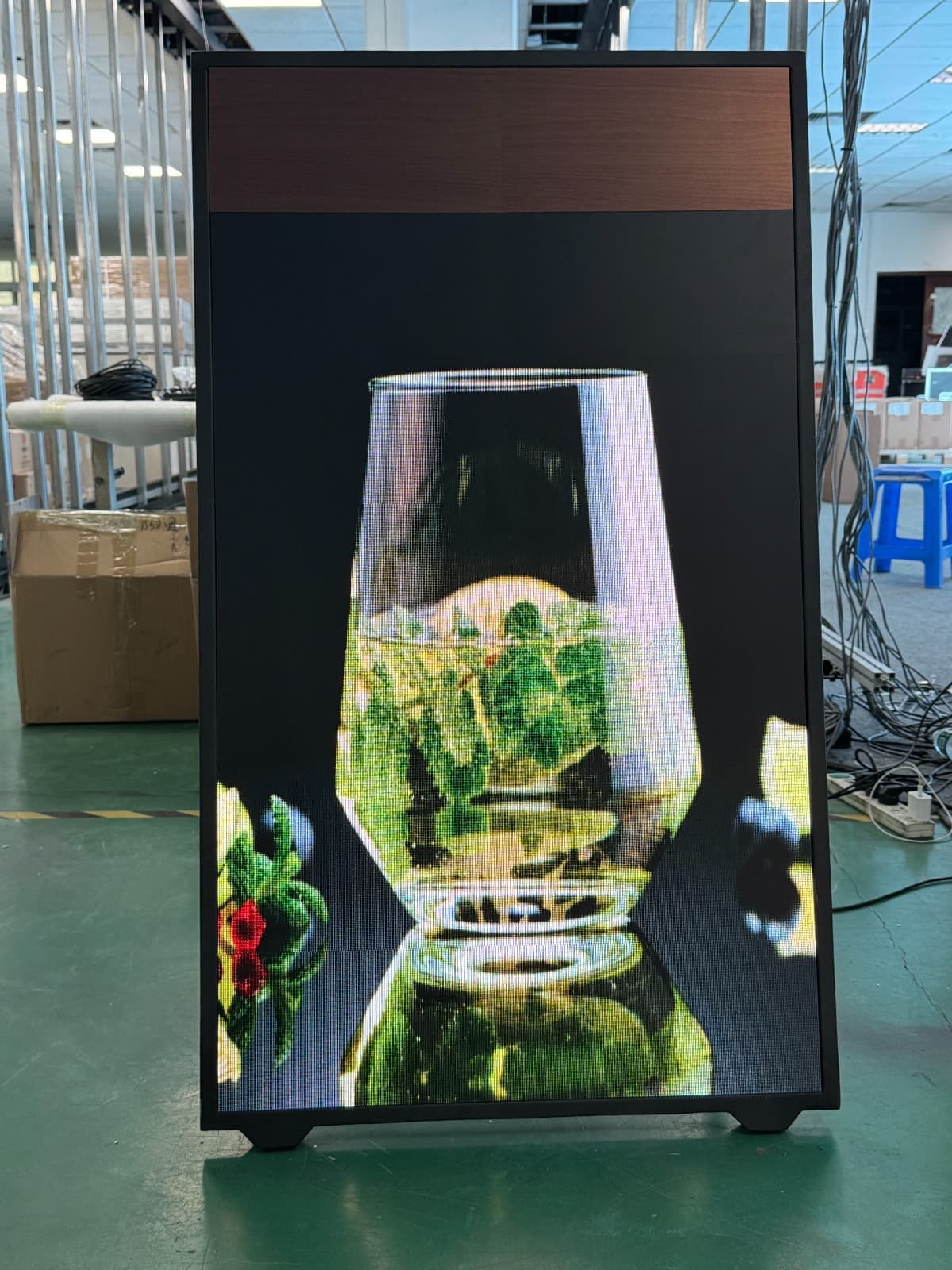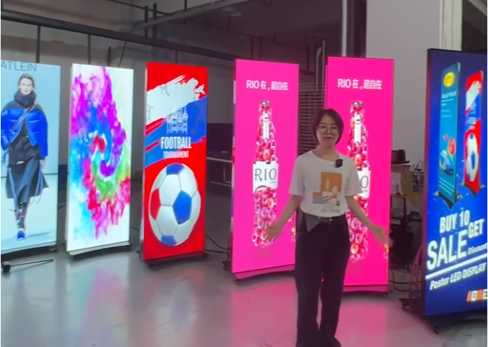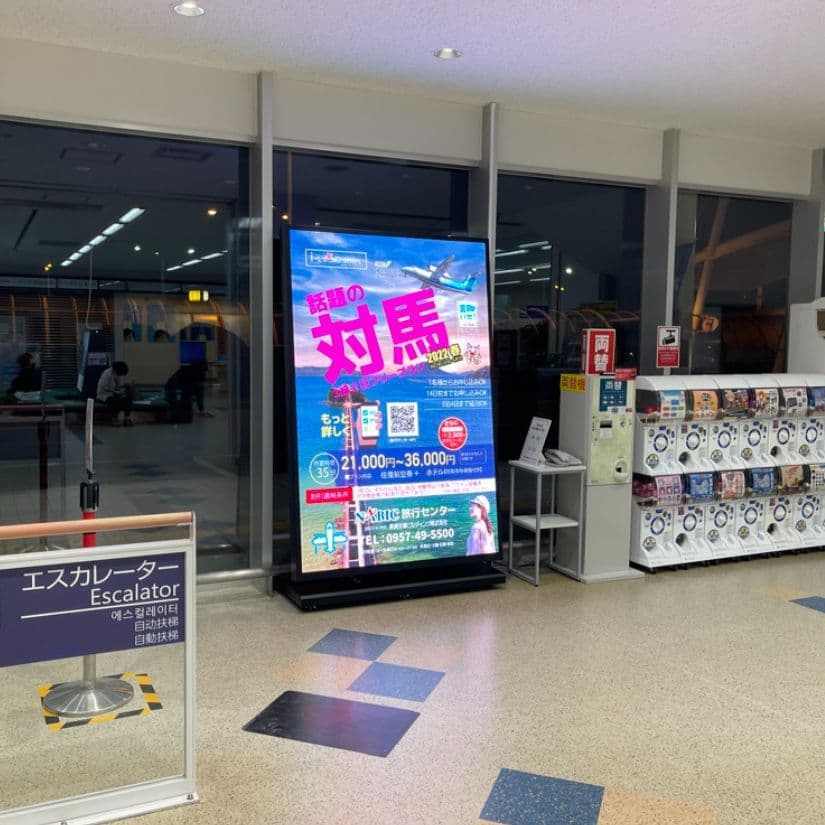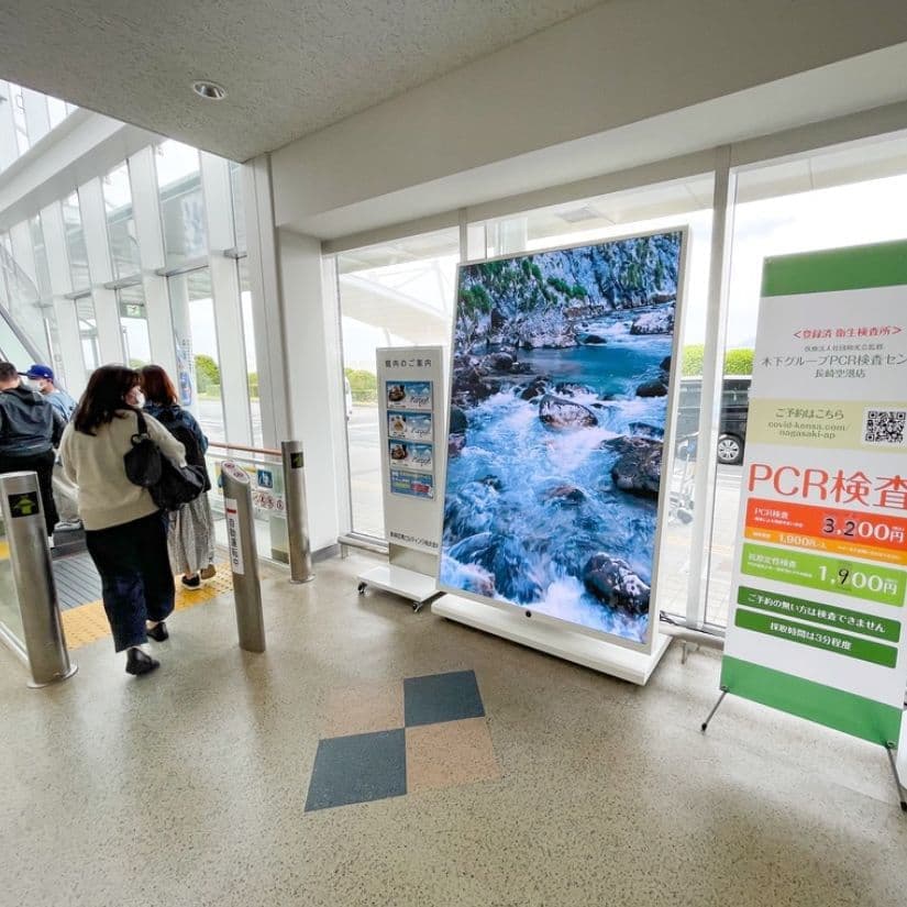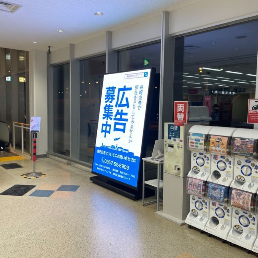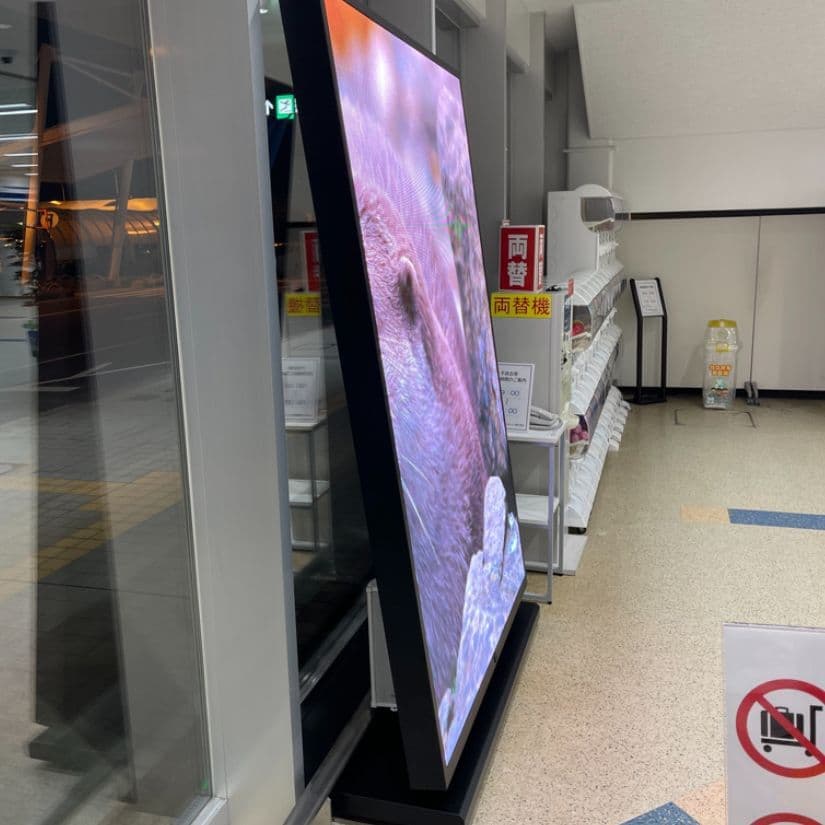当社では、オリジナル製品を販売しております。屋内用のデジタルサイネージは再現できない100インチ以上の大型サイズも3台から特注で製造可能です。写真の画面サイズは横幅1.28m×高さ1.96mで、輝度センサーで明るさを自動調節でき、傾斜角9度で見やすさを重視して設計しています。もちろんキャスター付きで移動ができ、薄型のため、壁面へのベタ着け出来ます。