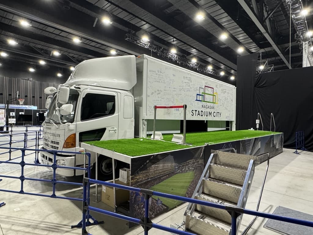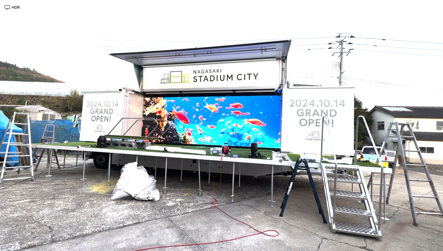 直射日光下の視認性を高めるため、BlackLEDビジョンを採用しました。解像度はP2.6で、BlackLEDビジョンの最高ピッチです。その画面を操作するスイッチャーや、画面の切り替えを裏から確認できる監視カメラ、ステージ照明やコントローラー、スピーカーを設置し、様々で使用できるステージカーを製造しました。長崎スタジアムシティ2024年10月開業までの1年間、長崎県の各市町村でPRイベントを開催するためのプロモーションカーです。