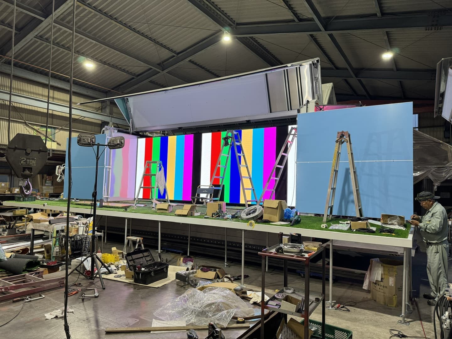当社ではトラックの架装から全て請け負っております。今回は車両選択から打ち合わせさせて頂きました。標準的な中型トラックは荷台の長さが6.3mほどです。この車両に幅6m×高さ2mのLEDビジョンを設置し、なおかつステージとして使える拡張された長さ10mのステージが必要でした。